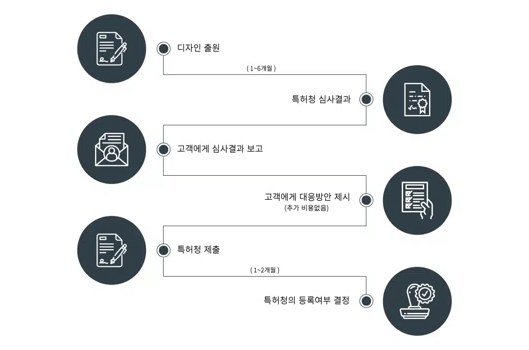 소담에 디자인 특허 출원을 의뢰하실 경우, 특허청 심사 결과가 나오기까지 약 1-6개월 정도의 시간이 소요될 수 있습니다. 특허청에서 출원 여부에 대한 결과가 나온 후 소담은 이에 대한 내용을 의뢰인에게 전달해 드립니다. 그 후, 출원 승인 여부에 따라서 의뢰인과 함께 대응방안을 함께 공유합니다. 이때 필요한 상담에 드는 비용은 일체 없습니다. 그렇게 대안을 수립한 후, 특허청에 다시 제출을 하여 1-2개월 정도의 시간이 지나면 특허청의 등록여부를 확인할 수 있게 되겠습니다.
