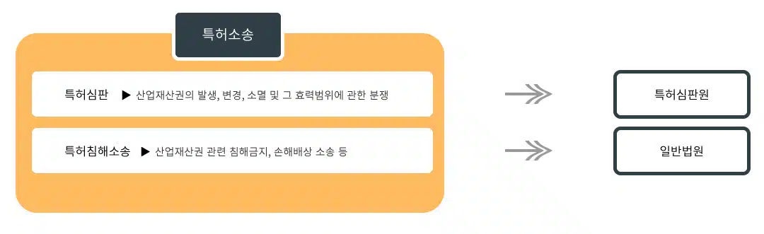 별도로 특허침해소송(침해금지청구, 손해배상, 신용회복 등)은 일반법원(서울중앙, 대전, 대구, 부산, 광주 등 전국 5개 지방법원이 1심 담당,