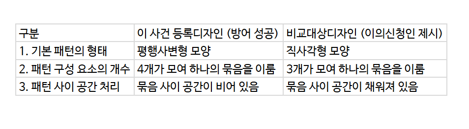 특히 기하학적 패턴 디자인의 경우 유사 범위를 좁게 해석해야 한다는 최근 심사 경향도 적극 활용했습니다. 누구나 사용할 수 있는 기본 모티프일수록, 작은 차이에도 큰 의미를 부여해야 한다는 논리였죠.