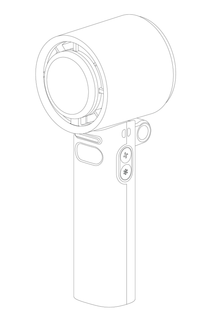 - 본원 디자인은 휴대용 선풍기에 관한 것으로서, 손잡이에 대해서 선풍기 헤드의 각도 조절이 가능하도록 구성되며, 손잡이 전면에 디스플레이부가 구성되고, 손잡이 측면에 풍량과 온도 조절을 위한 버튼이 구성됨.