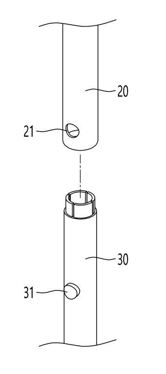 발명의 요약 : 실시예의 등산용 스틱은 상부에 위치되는 손잡이와, 상기 손잡이의 하부에 결합되는 제 1 폴과, 상기 제 1 폴 하부에서 삽입가능하도록 구성되면서, 상기 제 1 폴 하부에 배치된 압착 수단에 의해 위치가 고정되는 제 2 폴과, 상기 제 2 폴 하부에 삽입가능하도록 구성되면서 상기 제 2 폴에 형성된 돌기삽입홀에 돌기 결합됨으로써 길이 조절이 가능하도록 구성되는 제 3 폴과, 상기 제 3 폴 하부에 삽입가능하도록 구성되면서 상기 제 3 폴 내부에서 부피 확장됨으로써 고정력이 발생하도록 구성된 확장 수단이 구비된 제 4 폴과, 상기 제 4 폴 하부에 결합되며 스틱이 눈에 깊숙이 들어가거나 바위 틈새에 끼지 않도록 하기 위한 바스켓을 포함한다.