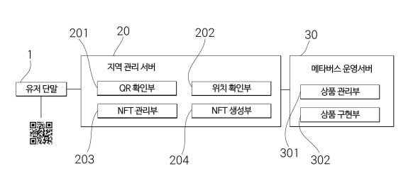 발명의 요약 : 본 실시예의 위치기반의 NFT 발급 시스템은, QR 코드를 인식할 수 있는 유저 단말과, 상기 QR 코드 정보와, 유저 단말 정보를 이용하여 NFT를 발행하고, 블록체인 기술 기반으로 이루어진 지역 토큰 서버를 포함하고, 상기 지역 토큰 서버는, 상기 유저 단말이 접속하는 경우에 상기 QR 코드에 의해 미리 설정된 관리 지역 정보를 확인하는 QR 확인부와, 상기 유저 단말로부터 전달되는 위치 정보를 확인하는 위치 확인부와, 상기 QR 확인부 및 위치 확인부를 통해 확인되는 정보와 상기의 접속한 유저 단말 정보를 검증하여 NFT 발급 여부를 판단하는 NFT 관리부와, 상기 NFT 관리부에 의해 검증된 경우에 상기 유저 단말로부터 전달되는 컨텐츠에 대한 NFT 발행을 수행하는 NFT 생성부를 포함하는 것을 특징으로 한다.