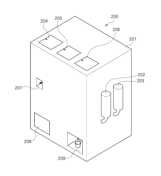 발명의 요약 : 본 발명의 음료 공급 장치는, 일체로 형성되고, 상하 방향으로 연장 형성되는 캡슐 바디와, 상기 캡슐 바디 내에 수용되고, 액체 또는 고체로 이루어진 충전물과, 상기 캡슐 바디 내에서 상기 충전물이 차지하는 공간 이외의 공간에 형성된 공기층으로 이루어지고, 상기 캡슐 바디의 상측 단부와 하측 단부에는 상기 캡슐 바디와 일체로 형성되면서 소정 길이 돌출 형성된 제 1 돌출부 및 제 2 돌출부가 구성되는 캡슐을 이용한 음료 공급 장치로서, 상기 캡슐이 보관되는 보관통과, 상기 보관통에 연결되어 상기 캡슐이 이동되도록 경로를 제공하는 공급 튜브와, 상기 공급 튜브를 통하여 빠져나오는 상기 캡슐을 지지하기 위한 고정부와, 상기 고정부에 안착된 상기 캡슐을 이동시키는 가압 수단과, 상기 가압 수단에 의하여 상기 캡슐의 하측으로부터 누출되는 충전물과, 물 또는 탄산수 또는 탄소 기체를 혼합하는 혼합 수단을 포함한다.