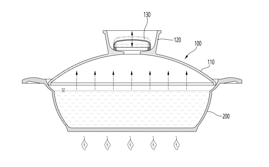 본 발명에 따른 조리용기 뚜껑은 중앙이 상측 방향으로 돌출된 형태로 형성되는 본체; 상기 본체의 중앙에 위치하고, 하측 방향으로 개방된 제1개구와 상측방향으로 개방된 제2개구를 포함하는 손잡이; 상기 손잡이 내부에 배치되어 상기 제1개구에 놓여지는 넘침 방지용 마개; 및 상기 손잡이에 결합되어 상기 넘침 방지용 마개가 쉽게 분리되지 않도록 가이드하고, 내부 압력을 완화하기 위한 관통구가 형성되는 커버를 포함한다.