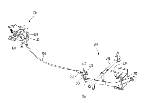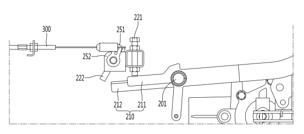 발명의 요약 : 실시예의 이앙기는, 식부하는 모의 양을 작업자가 선택할 수 있는 주수 선택 레버와, 이앙기의 작업 속도를 조절하기 위하여 작업자가 조작하는 가속 페달과 연결되어 상기 가속 페달의 조작에 따라 회전하도록 구성된 가속 페달 회전부를 포함하는 이앙기에 있어서, 상기 주수 선택 레버에 의해 선택되는 식부 주수를 확인하기 위한 주수 변속 센서와, 상기 주수 변속 센서로부터 전달되는 신호에 따라 회전하도록 구성된 회전캠과, 상기 회전캠에 연결되고, 상기 회전캠의 기설정된 방향으로의 회전에 의해 당겨지는 속도 규제 와이어와, 상기 속도 규제 와이어와 연결되고, 상기 속도 규제 와이어의 이동에 의하여 소정 각도 회전되는 와이어 연결부와, 상기 와이어 연결부의 회전과 함께 회전되는 제 2 스톱 볼트와, 상기 제 2 스톱 볼트의 하단보다 더 높은 위치에 하단이 위치하도록 구성된 제 1 스톱 볼트를 포함하고, 상기 가속 페달 회전부는 상기 제 1 스톱 볼트 또는 제 2 스톱 볼트의 하단에 접촉하는 경우에 회전이 제한되도록 구성되는 것을 특징으로 한다.