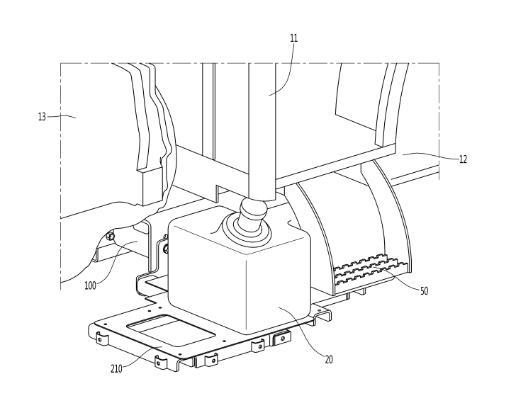 발명의 요약 : 본 실시예의 트랙터의 연료탱크 고정 장치는, 캐빈프레임 하측에 마련되는 연료탱크를 포함하는 트랙터의 연료탱크 고정 장치로서, 상기 캐빈프레임 하측에 결합되거나, 엔진에 연결되는 트랜스미션의 하측 또는 일측에 결합되는 지지대 고정수단과, 상기 지지대 고정수단의 일측에 결합되고, 상기 연료탱크의 하부면을 지지하는 연료탱크 지지대를 포함한다