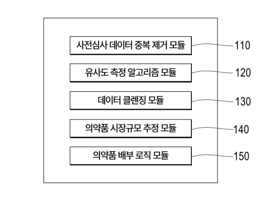 발명의 요약 : 실시예의 시스템은, 요양급여 사전심사에서 발생하는 중복 데이터를 식별하고 제거하는 AI 기반 사전심사 데이터 중복 제거 모듈; Jaccard 유사도 알고리즘을 사용하여 사전심사 데이터 간 유사성을 비교하고 중복 여부를 판별하는 유사도 측정 알고리즘 모듈; 중복성을 제거한 데이터를 선택하여 저장하는 데이터 클렌징 모듈; AI 모델을 사용하여 의약품의 시장 규모를 예측하는 의약품 시장 규모 추정 모듈; 및 예측된 시장 데이터를 기반으로 의약품을 지역 및 진료과 단위로 배분하는 의약품 배부 로직 모듈;을 포함한다.